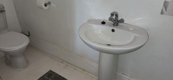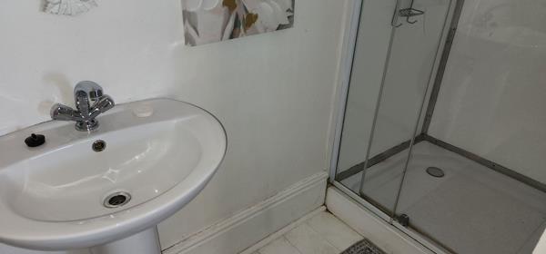 Bathroom for Bedroom 2 and 3 Full bathroom with shower, bath, toilet and basin. Wooden floors and curtain rails.