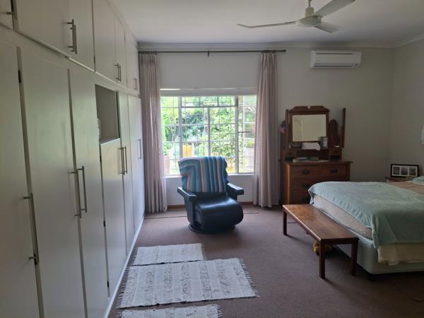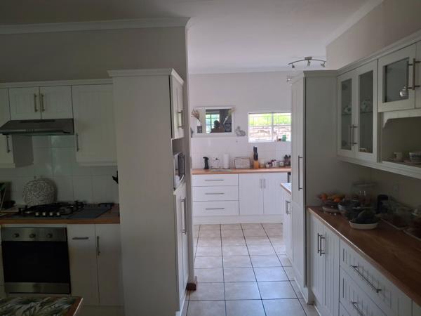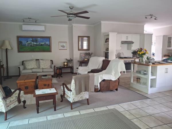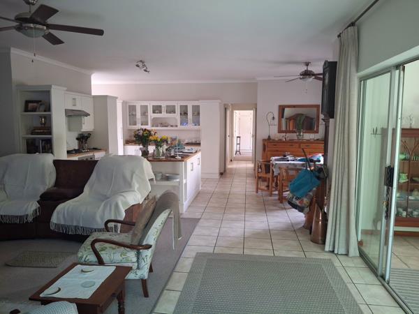 The living areas are spacious, with an open-plan kitchen, dining room and lounge, which leads into a lovely airy sunroom. Sliding double doors open onto a covered patio with beautiful mountain and garden views, offering tranquility and privacy. The patio has a louvred roof, which adds to its versatile use, ideal for entertaining.