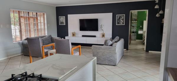The spacious open-plan lounge. with an air-conditioner, flows into a well-designed kitchen, with a separate scullery.