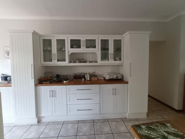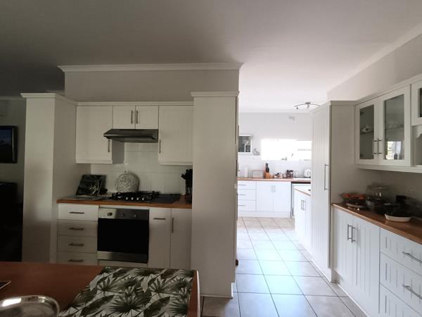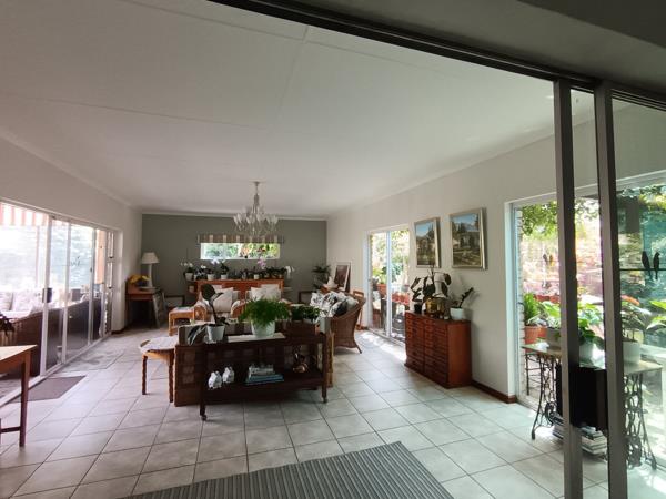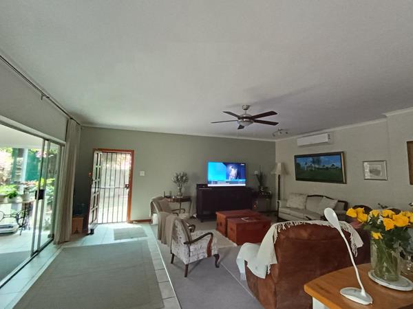 The open-plan lounge, dining room, and kitchen are designed for both functionality and style, complete with ample cupboard space and a convenient scullery. A cozy TV room, with sliding doors, seamlessly connects indoor living to the garden, enhancing the home''s charm.