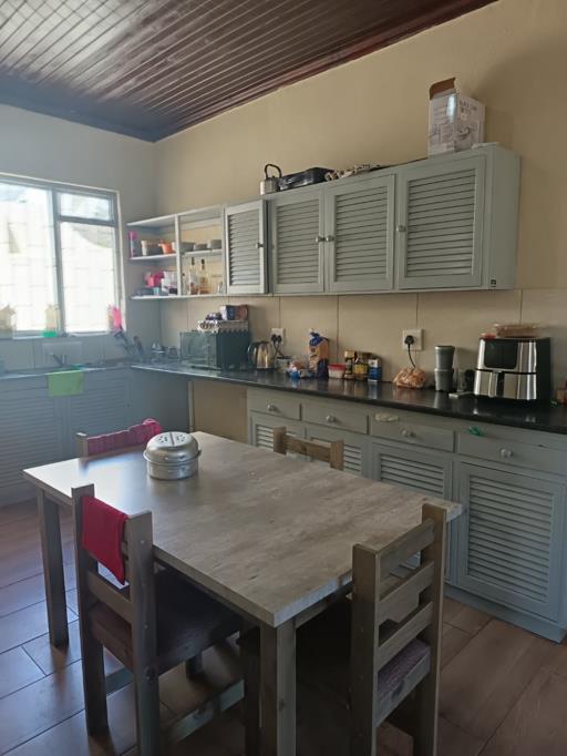 The third bathroom caters to the remaining two rooms, ensuring convenience for all. Inside, youll find a mix of wooden and carpeted floors. Additional features include a laundry room located in the outbuilding and a separate one-bedroom flatlet equipped with a small kitchen, perfect for visitors or rental income.
