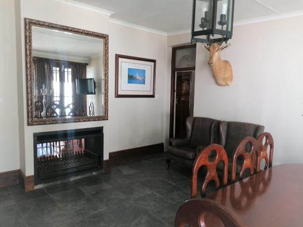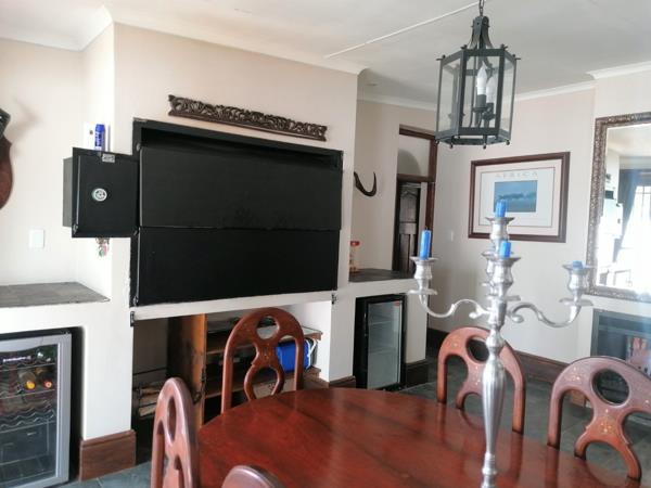 Double- sided fireplace, between the dining room and indoor braai area. Indoor braai with stack doors leading onto the patio next the pool.