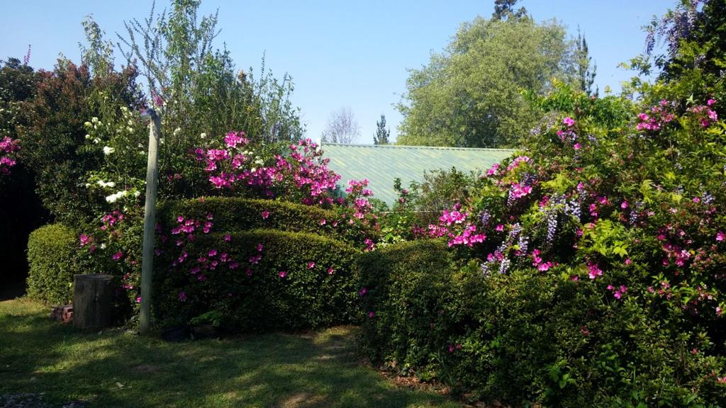 The main house has three bedrooms and sits surrounded by an established garden filled with evergreens and natural forest. Birdsong fills the air, adding to the stillness that makes this place feel worlds away from busy life.