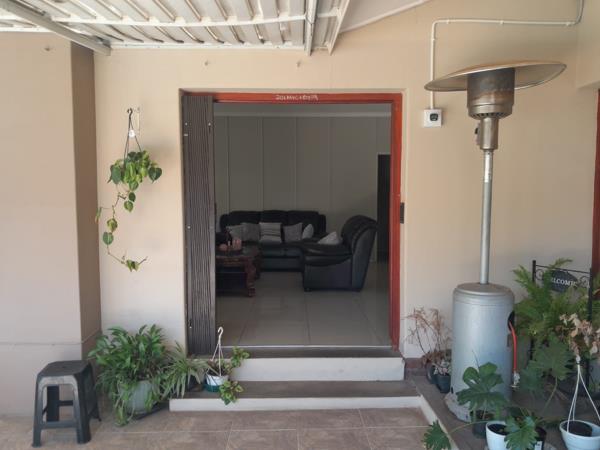 As you enter the home, the cozy TV room is located on the left, featuring a glass door with wooden frames that opens onto a private patio with a built-in braai, overlooking the sparkling swimming pool. The large, sunlit lounge and dining areas are perfect for gatherings, with big windows that fill the rooms with natural light. The wooden-framed doors open to the expansive garden, while a fireplace with wooden tops and chimney provides a warm, inviting ambiance for colder months. A second wooden-framed door with a trellidoor leads to the patio, pool area, and an entertainment-friendly lapa with a thatched roof, ideal for hosting family and friends.
