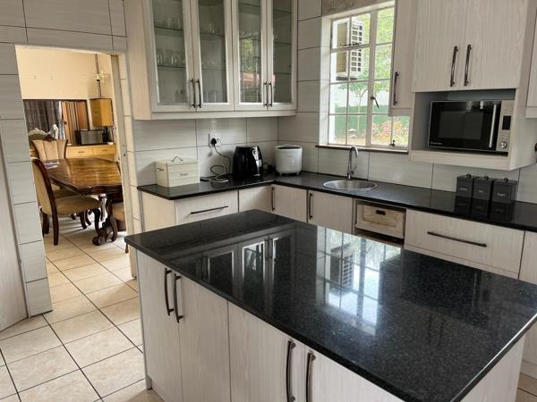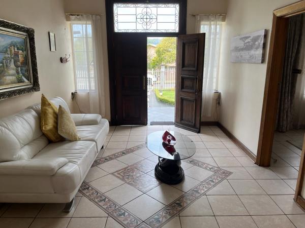 Spacious five bedroom family home with two lounges, two dining rooms and a modern kitchen. The house has a lovely Cape Dutch design with loads of character. There is a lovely pool with a spacious garden and a flatlet with its own entertainment area. A double garage with five spacious carports. The property has a borehole and electric fencing as well as an alarm system. This home is ideally suited for a big family.