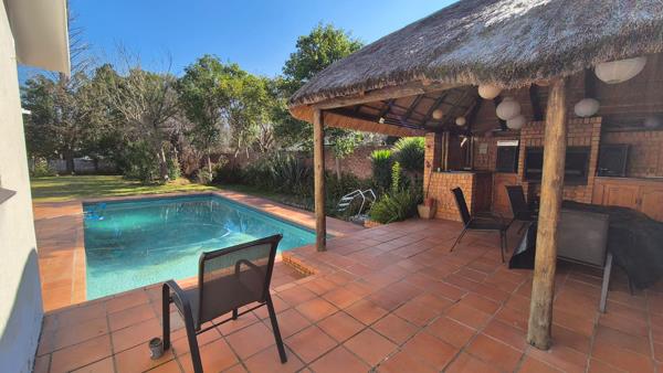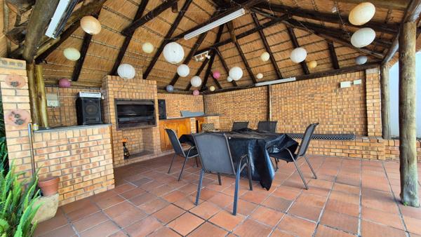 Entertainment is a key highlight, with a dedicated indoor barbecue area, sauna, and a sliding door opening onto a sparkling outdoor pool. The pool is complemented by a thatched Lapa with a patio perfect for gatherings with family and friends.