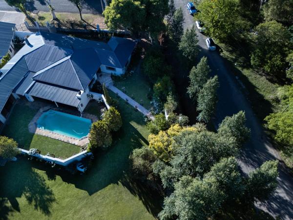 From the pool patio, steps lead down to a delightful children''s play area and a lush, tree-surrounded garden, complete with a computerized sprinkler system and borehole, creating a serene outdoor retreat.