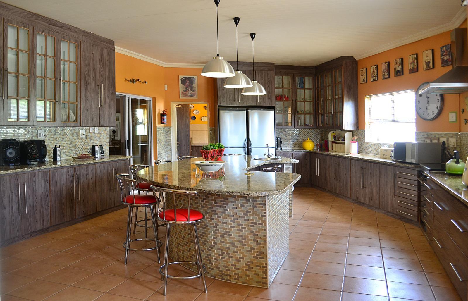 Gourmet Kitchen: The heart of the home is a vast open plan kitchen equipped with built-in cupboards, luxurious granite tops, a combined gaselectric stove, and a separate laundryscullery, complete with built-in cupboards and both a twin basin and a large single basin. The kitchen seamlessly flows into a large dining room and two expansive open plan living and entertainment areas.