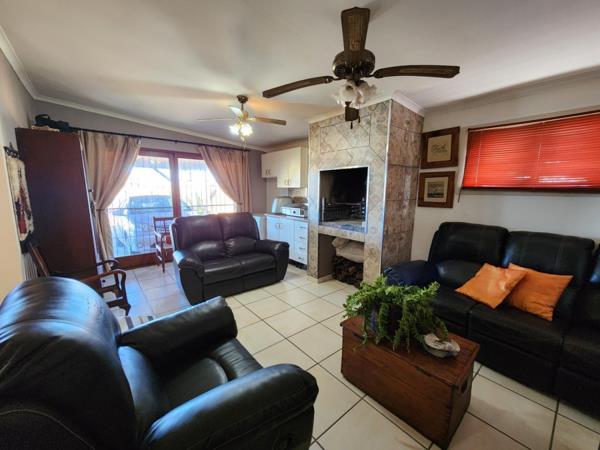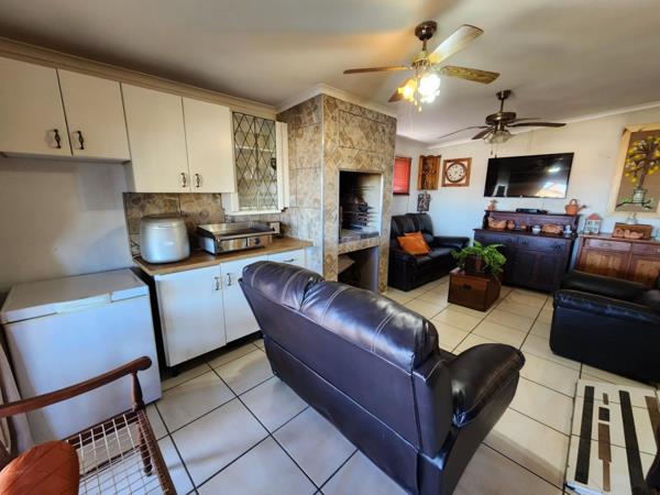 A focal point of the interior, the spacious lounge beckons with an inviting atmosphere, complete with an indoor braai that promises cozy evenings by the fire. Adjacent to the lounge, an elegant dining room sets the stage for refined meals, perfectly complementing the adjacent well-equipped kitchen. Sunlight streams into the kitchen through a skylight, suffusing the space with natural radiance and creating an inviting environment for culinary endeavors.