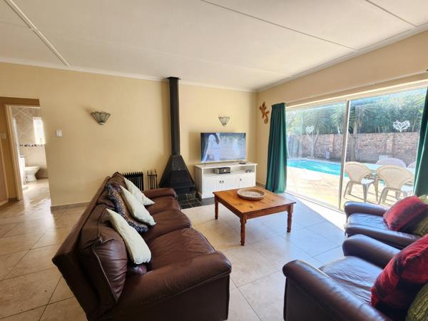 DUAL MANDATE - This property features four bedrooms and two bathrooms, along with an 18-meter-long swimming pool, making it ideal for individuals who practice or teach swimming. Additionally, it boasts an outdoor entertainment area, a separate scullery, and a perimeter wall surrounding the property. The kitchen is equipped with a 5 burner gas stove and includes a connection for a dishwasher, all within an open-plan layout that seamlessly integrates the kitchen, living room, and dining area. The property also offers a double garage with individual roll-up doors and an electric gate for added security. Furthermore, there is an outbuilding that can serve as storage or be converted into a home office, kids playroom, hobby room or what ever you need it for.
