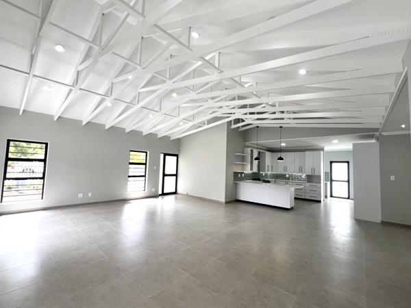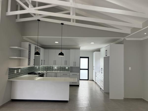 At the heart of the property lies a signature open-plan kitchen, enhanced by elegant strip lighting that brightens the expansive counterspace. Ample built-in cupboards and a separate sculleryequipped with plumbing for a dishwasherensure exceptional practicality. The double garage offers direct access into the home and includes plumbing for a washing machine, as well as an inverter-ready DB for added convenience.