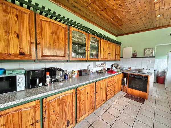 The kitchen is a chefs dream, with an abundance of cupboard space, a large double sink, and a generous window that looks out over the lush garden. Adjacent to the kitchen is a separate scullery, offering space for a double-door fridge and all your appliances.