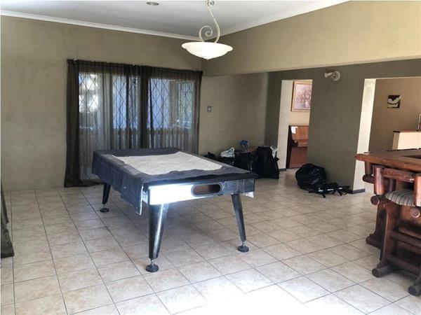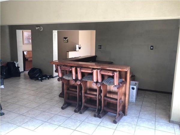 This spacious home features an open plan layout with a large lounge, family room, entertainment lounge with a built-in braai and bar, and an adjacent dining area. The well-equipped kitchen includes plenty of built-in cupboards, an electric hob, an under-counter oven, and fittings for a dishwasher and washing machine. There are three bedrooms with built-in cupboards, and the master bedroom has an en-suite bathroom. The enclosed yard offers privacy, and there is open parking for multiple vehicles.