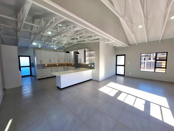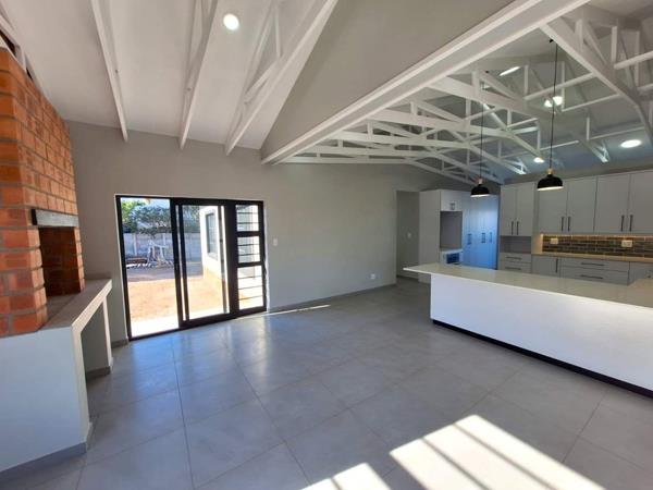 The modern open-plan kitchen boasts ample storage, a gas hob, electric oven, and a seamless flow into the dining and lounge area. A built-in braai, which doubles as a fireplace, makes entertaining easy, while exposed roof trusses add a sense of openness and style.