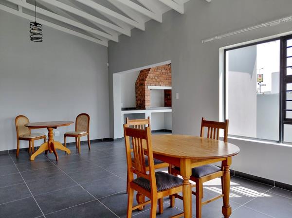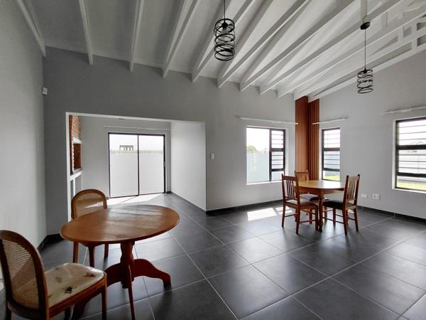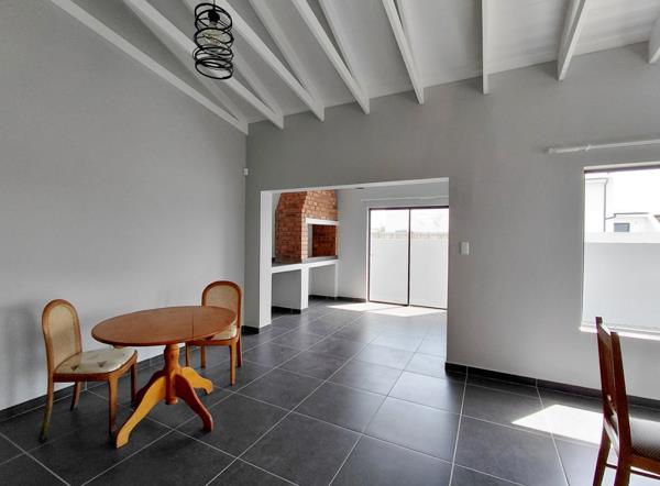 This lovely home offers three good-sized bedrooms and two bathrooms, with the main bedroom featuring its own en-suite. The open-plan kitchen, living area, and braai make it perfect for family time and entertaining. A separate scullery adds extra convenience, while a single garage and small storeroom provide practical storage.