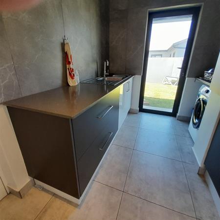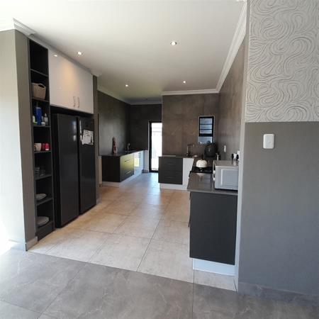 The home opens into the L-shaped open plan lounge, dining room and kitchen. The braai is in the dining room which has stacker doors out to the garden. The fireplace for cosy nights is in the lounge.