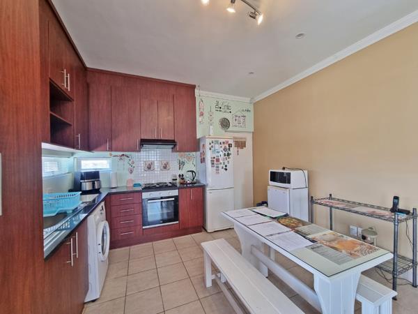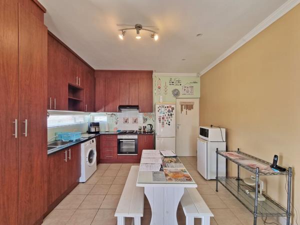 The well-appointed residence has a practical kitchen that serves as the home''s focal point, featuring an electric stove and hob, washing machine connections, and generous built-in cabinetry, all flowing into the open-plan lounge to create an inviting, functional space perfect for both daily living and entertaining.