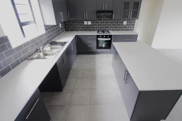 A modern open-plan kitchen has beautiful Quartz tops with plenty of cupboards and a funky backsplash that adds personality
