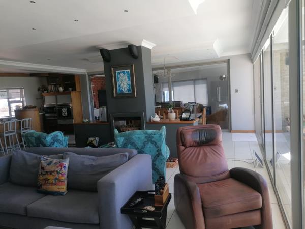 The main level presents a generous open-plan layout anchored by a sophisticated lounge with a feature gas fireplace. The dining area flows into a beautifully appointed kitchen fitted with premium appliances. An entertainment lounge with built-in braai opens directly onto the sunlit patio and infinity pool, creating an inviting setting for relaxed living and memorable gatherings. The master suite occupies a prime position on this level, complete with a private balcony, indulgent en-suite, and heated towel rails.