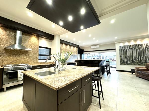 In summary, this waterfront home in the Marina Martinique offers 720 square meters of pure luxury. It boasts 5 en-suite bedrooms, a games room, breathtaking canal views, large open plan spaces, a study and gym area, and various standout features including air conditioning in all rooms, a walk-in safe, built-in stainless steel braais, beautiful trees, Smeg kitchen appliances, six garages, a sweeping driveway, and a bar area.