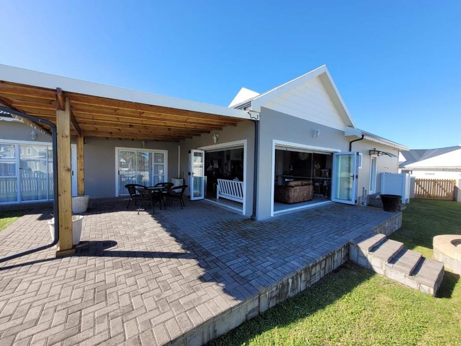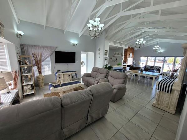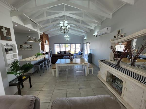 Inside, the home boasts a spacious open-plan design with high, exposed truss ceilings that enhance the sense of light and space. The open living area includes a TV lounge, dining room, and an entertainment area with a built-in stainless steel braai and two sets of stacking doors seamlessly connecting indoor and outdoor living spaces.
