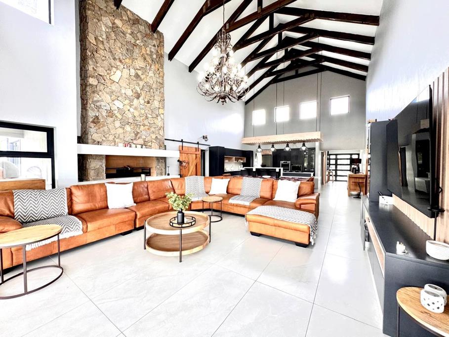 Step inside to find a double-volume, open-plan living space with a spacious lounge, dining, and designer kitchen all flowing seamlessly onto a large undercover patio that is sheltered from the wind. Here you can entertain family and friends with ease, featuring a built-in braai, wood-fired pizza oven, and tranquil canal views.