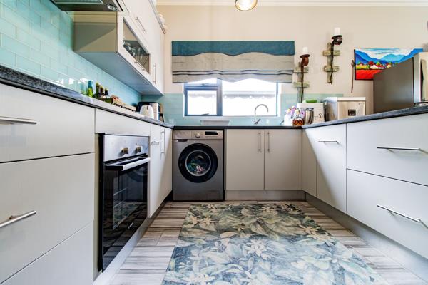 The home offers a spacious open-plan lounge and kitchen, fitted with granite countertops, neat cabinetry, and a Bosch gas stove and oven. A convenient wet point is available in the kitchen, with an additional wet point in the fully tiled single garage, which also includes extra packing space and a built-in cupboard.