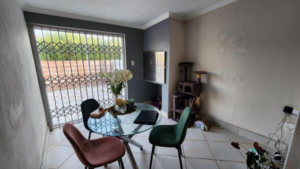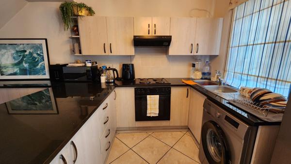 Upon entering through the automated garage gate, youll find a covered carport for added convenience. The front door opens into a modern open-plan kitchen, complete with built-in cupboards, sleek black granite countertops, hob and stove, and a washing machine connection. The kitchen flows into a cozy lounge area, leading to the braai room which doubles as a dining space. Sliding doors open onto a private courtyard, secured with Trelli door gates, providing both privacy and peace of mind.