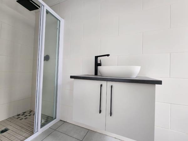 The lower level features 2 stylish bathrooms, including an en-suite, an open-plan kitchenette seamlessly merging with the lounge, and a convenient storage area under the stairs. Ascend to the upper level to find 2 additional bathrooms, one en-suite, and a spacious open-plan lounge with a built-in braai for entertaining.