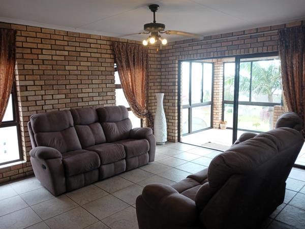 A generous living room with a sliding door that opens into a cozy indoor braai area.