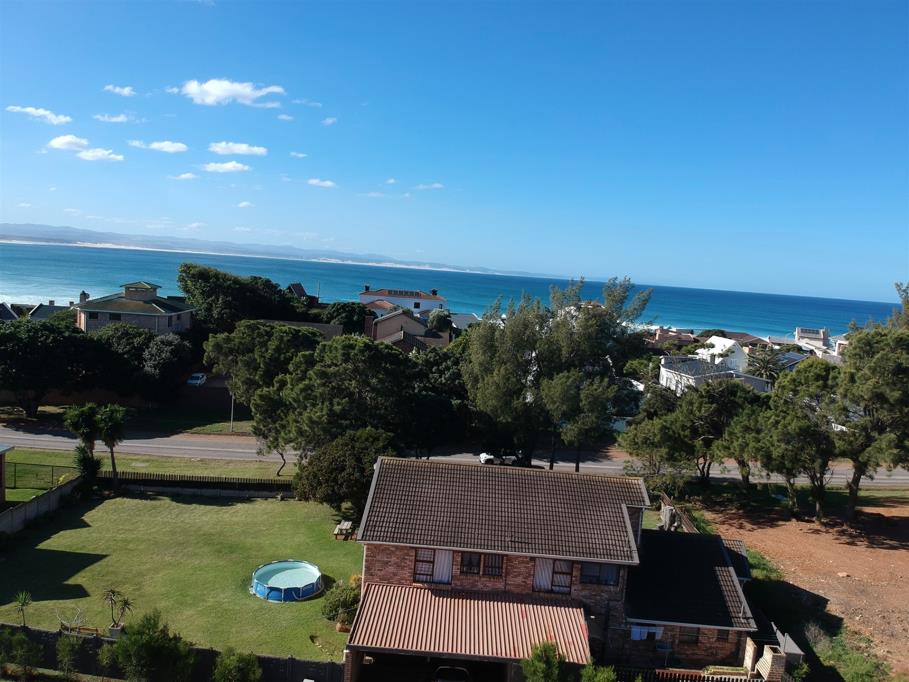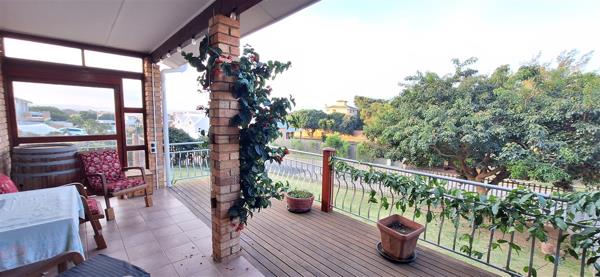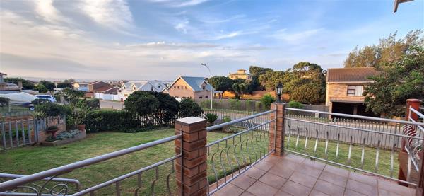The fully fenced garden offers a mix of lawn and established plants, with a glimpse of the ocean visible from the patio.