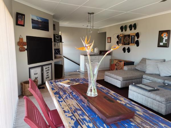 The home boasts a well-appointed kitchen, open-plan dining room, and a cozy lounge perfect for entertaining or quiet family time. A separate scullery keeps the kitchen neat and practical, while the spacious indoor braai room offers beautiful sea views ideal for year-round gatherings.