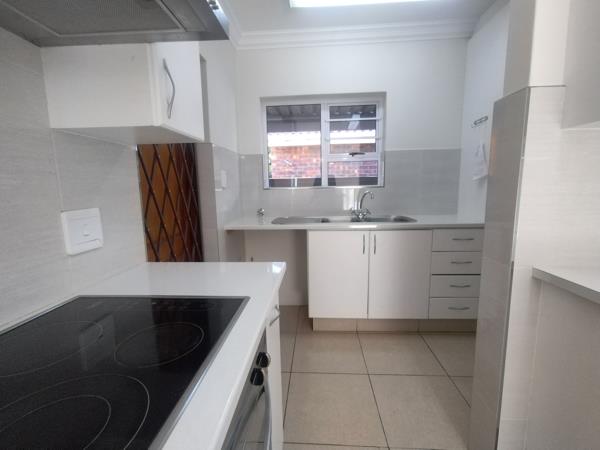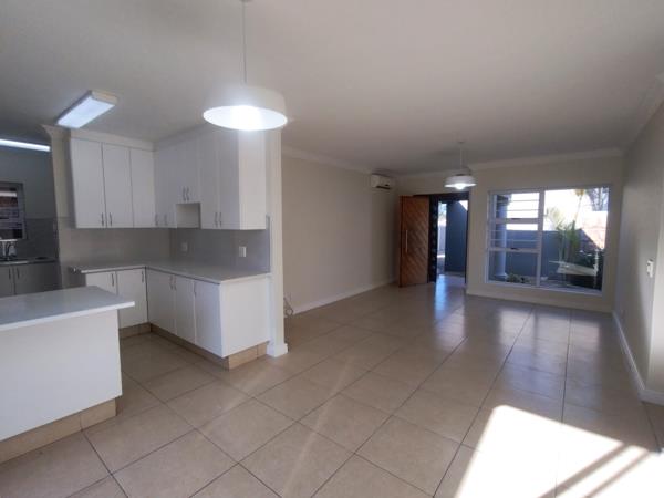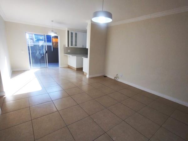 Spacious open-plan living and dining area opening onto a semi-enclosed patio with built-in braai and small private garden