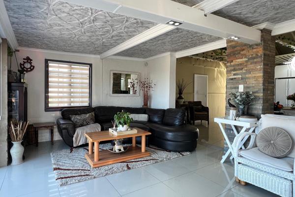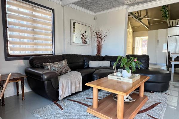 The open-plan living area is a true showstopper combining a modern kitchen, dining space, and lounge with an indoor built-in braai for year-round entertaining. Striking high ceilings with exposed trusses, charming bay windows, and natural light streaming in create a bright, airy atmosphere. The kitchen is both functional and beautiful, with ample cupboards, a gas hob, and a separate scullery.