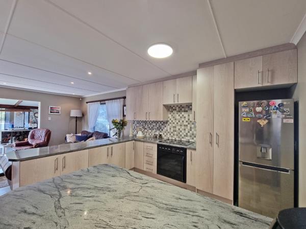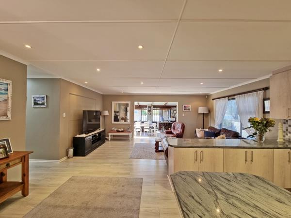 This single-storey home was designed with easy family living in mind, featuring open plan living areas including a welcoming entrance hall, a cozy lounge and dining room, as well as a tiled indoor braai area, perfect for hosting friends and family all year round. A functional Kitchen with beautiful built-in cupboards and a tucked away scullery, makes meal prep and clean-up effortless. Step outside onto the open deck and enjoy peaceful evenings soaking in the fresh coastal air.