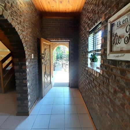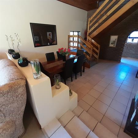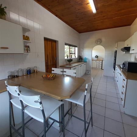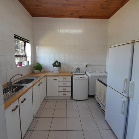 Stairs at the dining area lead to 2 further family bedrooms with a spacious main bedroom with full bathroom. Off the upstairs landing is the deck where lovely distant views can be enjoyed. The family bedrooms have windows looking over the lovely kloof.