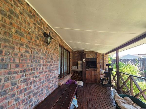 A lovely open wooden patio with a built-in braai. You can sit on the patio and watch the children play on the grass.