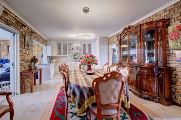 Step inside to find an open-plan layout that exudes warmth. The dining room, which comfortably accommodates a 12-seater table, flows into a sunlit sunroom and an inviting indoor braai room, creating a harmonious space for dining and relaxation. The modern kitchen with ample cupboard space is a delight flowing to the original kitchen with a gas stove and an eye-level oven. Kitchen is connected to the scullery with ample space for laundry appliances..