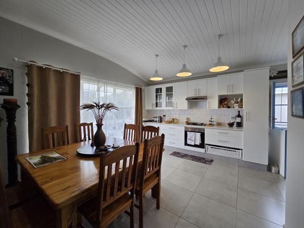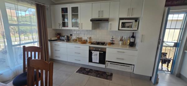 The bright and airy open-plan lounge and dining area extends seamlessly to a sheltered, north-facing patio with a built-in braai an inviting space for relaxed breakfasts, casual entertaining, or unwinding at sunset. A sleek modern kitchen, finished with quartz tops and generous cabinetry, makes everyday life both practical and elegant.