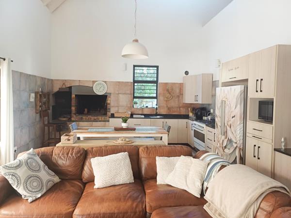 For those cooler evenings, an indoor fireplace beckons you into the lounge, perfect for indoor braais, games evenings or a curry on the gas stove. Guests can gather round and have a glass of red wine or mug of hot chocolate and enjoy the whole ambience. Glass doors lead out to a sun drenched patio, complete with a built-in braai ideal for relaxed gatherings after a day spent fishing, playing sports or just watching the children frolicking in the privately appointed garden.