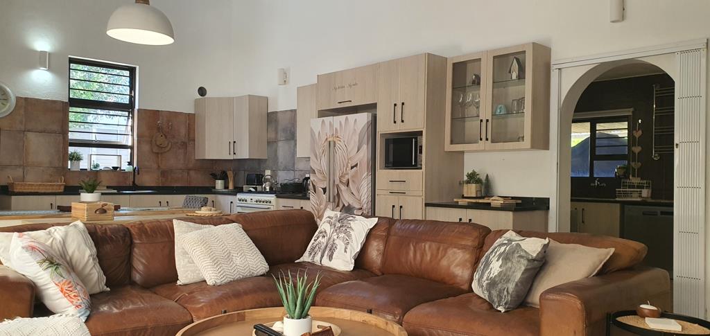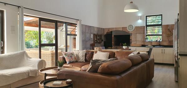 Spacious open-plan lounge, dining area, and kitchen with built-in braai