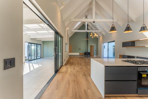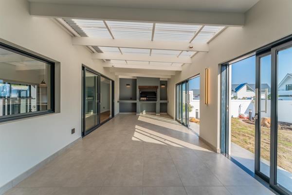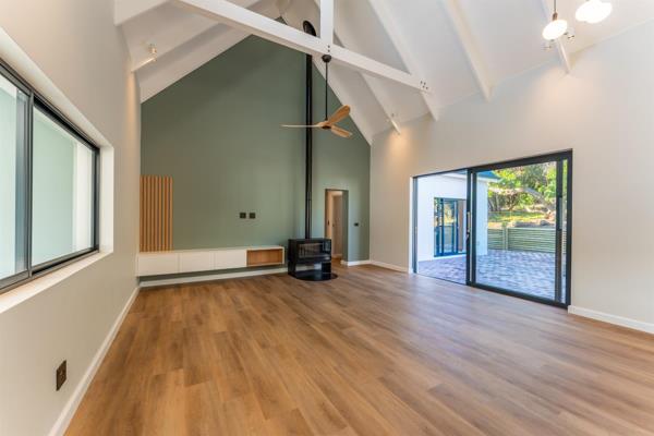 The adjoining glass-enclosed sunroom, complete with a built-in braai, flows directly into the landscaped garden, creating a year-round indoor-outdoor hub for relaxed gatherings. A guest toilet offers convenience for visitors and family.