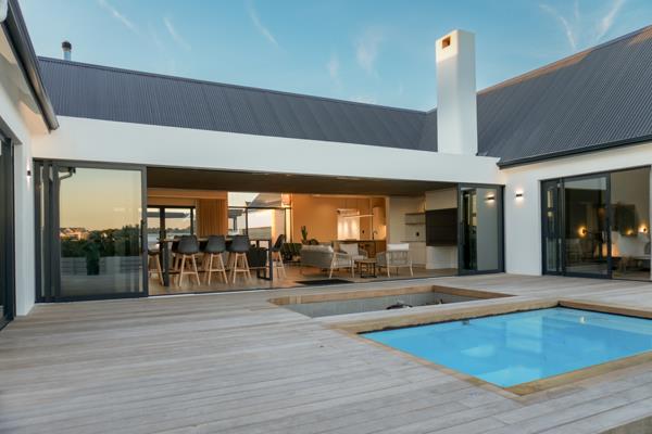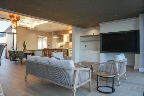 The well proportioned areas that greet you on arrival are a feast for the senses with thoughtful lighting and wall finishes. Anchored by a generously sized kitchen, the vast open plan area includes dining, living and entertainment areas which furthermore are complimented by a built in braai and well designed cocktail serving area custom fitted with beverage coolers and an ice maker. A braai pit and plunge pool extend the entertainment offering of this generous space. The warm living space enjoys wonderful north orientation but is furthermore warmed by a well positioned wood burning fireplace.