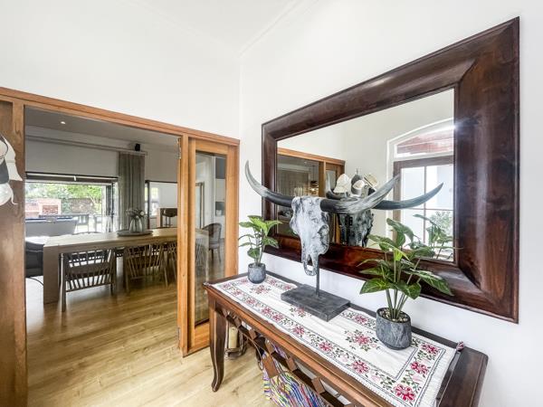 An elegant entrance hall sets the tone for sophistication opening onto a spacious lounge with cozy fireplace, plantation shutters, and seamless flow to entertainment zones which includes a bar area, games area and indoor braai. A Gourmet open-plan kitchen features a central island with gas hob and extractor fan. A touch of elegance and warmth is added with mood lighting for evening ambiance and an adjacent scullery for effortless hosting.