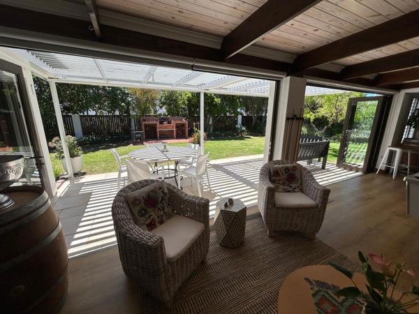 Just opposite the kitchen, youll find a dedicated bar area that leads onto the patio , complete with a built-in braai and handy roller blinds so you can enjoy the space no matter the weather. All the sliding doors in the living area open onto this patio, allowing the indoors to flow seamlessly outside. From here, the patio extends into the garden, making it an ideal entertainment area for family and friends.