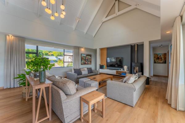 The interior is equally refined with the spacious, open-plan living area with soaring vaulted ceilings being the heart of the home. It encompasses an integrated lounge and dining room that flows onto the generously sized outdoor verandah and also merges with the beautifully appointed kitchen.