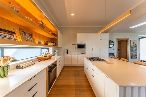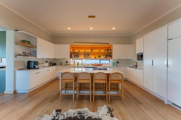The sleek white kitchen, with remarkable accent lighting features, has exceptionally generous cabinetry, including a sleek pantry area, and a central island featuring a gas hob. Adjoining the kitchen is a cocktail bar TV lounge which also connects to the verandah, extending the homes social heart to the outdoors. The kitchen also has a separate scullery and utility area, intelligently positioned out of the direct sightline.