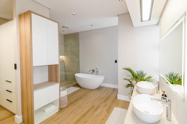 The home offers four generous bedrooms, each en suite, ensuring privacy and comfort for family and guests. The main suite includes air conditioning and a beautifully appointed bathroom with heated towel rails and fancy mirrors. A pajama lounge provides an additional cozy living space, perfect for relaxing.
