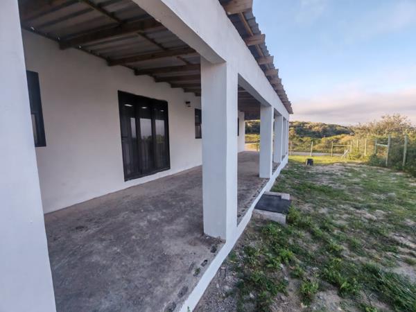 This unfinished 2-bedroom, 1-bathroom house features an open-plan living space and kitchen, a small pantry, and sliding doors from the living area onto an enclosed stoep. The stoep offers the potential for a braai and sea views. Basic carpentry and finishes will make this a beautiful investment. Prepaid electricity, an alarm system, and two plumbed-in 5000l water tanks are already installed.