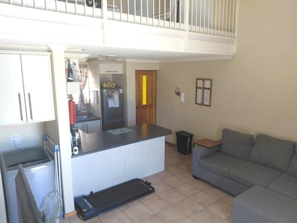 On the ground floor, youll find an open-plan lounge and kitchen, neatly tiled and well designed. The kitchen offers built-in cupboards, an electric stove with hob, double basin, and space for a washing machine.